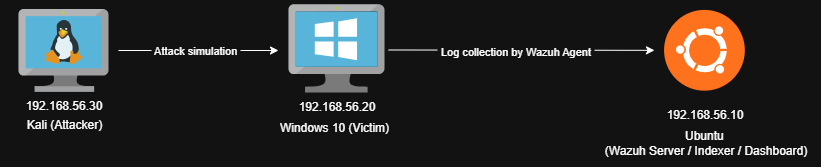 Minimal lab topology: Kali (attacker) → Windows (victim, Wazuh agent) → Wazuh Manager (SIEM & Active Response).